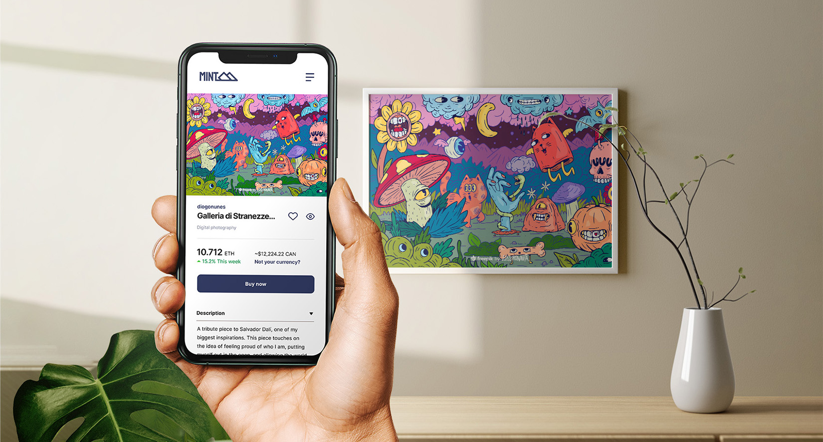 I worked with a multimedia designer to design an app that makes it easier for consumers to access quality digital art. Mint is a platform for users to buy, sell, and auction NFTs (2022).
